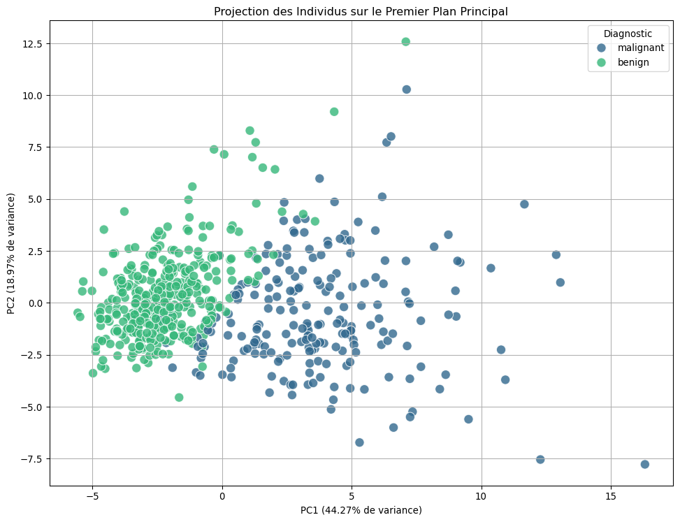 Observation : Les deux classes de tumeurs (malignes et bénignes) sont remarquablement bien séparées sur ce plan, suggérant une structure sous-jacente forte dans les données.