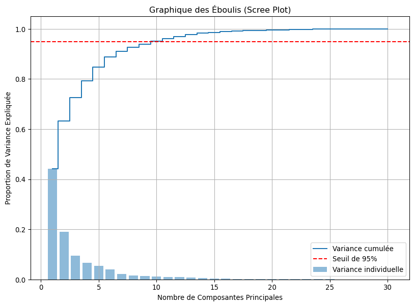 Le “scree plot” ou graphique des éboulis nous aide à choisir le nombre de composantes à retenir en visualisant la variance expliquée par chacune.