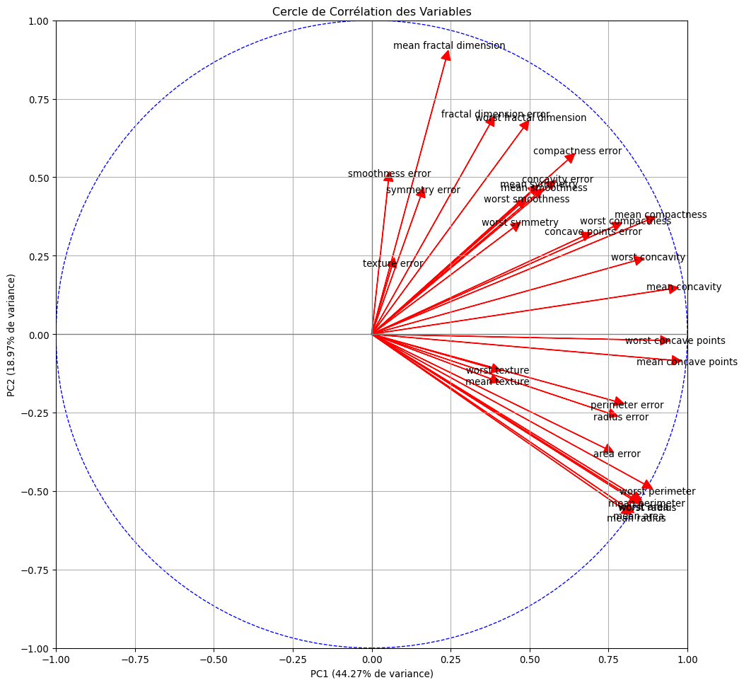 Exemple avec nos données sur le cancer : * Le graphique des individus montre les tumeurs malignes à droite (PC1 > 0). * Le cercle de corrélation montre que des variables comme mean radius et mean perimeter sont fortement corrélées à PC1 (leurs vecteurs pointent vers la droite). * Conclusion croisée : Les tumeurs malignes sont donc caractérisées par des valeurs élevées de rayon moyen, de périmètre moyen, etc. Ce qui est tout à fait logique. L’ACP a réussi à capturer cette structure et nous permet de l’interpréter visuellement.