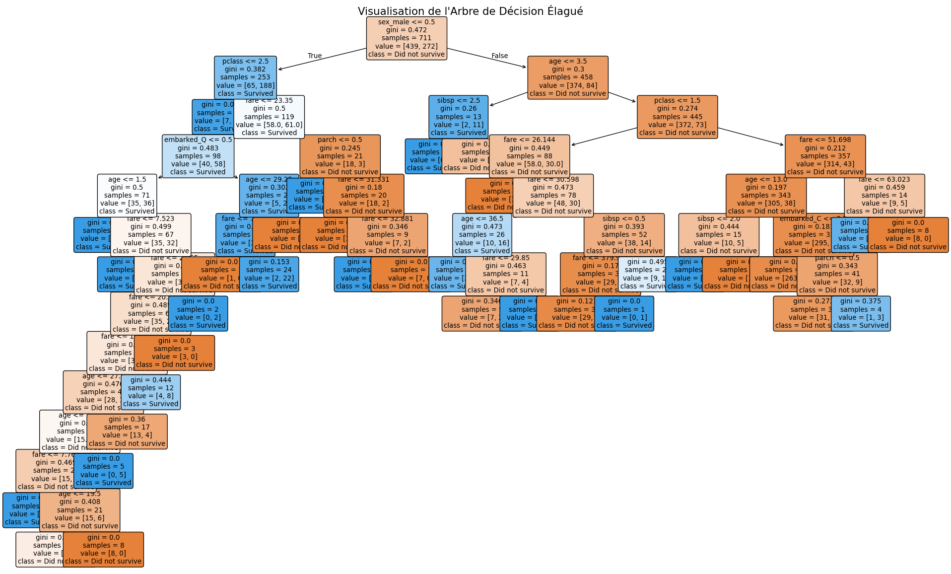 import pandas as pdimport numpy as npfrom sklearn.model_selection import train_test_split, cross_val_scorefrom sklearn.tree import DecisionTreeClassifier, plot_treefrom sklearn.preprocessing import OneHotEncoderfrom sklearn.compose import ColumnTransformerfrom sklearn.pipeline import Pipelineimport matplotlib.pyplot as pltimport seaborn as sns# --- 1. Charger et préparer les données depuis Seaborn ---print("--- Chargement et préparation des données Titanic ---")titanic = sns.load_dataset('titanic')# Sélection des variables et de la cible# On retire les colonnes redondantes ou avec trop de valeurs manquantes pour cet exempleX = titanic.drop(['survived', 'alive', 'who', 'adult_male', 'deck', 'embark_town', 'class'], axis=1)y = titanic['survived']# Gérer les valeurs manquantes de manière simple# Pour l'âge, on remplace par la médianeX['age'].fillna(X['age'].median(), inplace=True)# Pour 'embarked', on supprime les 2 lignes où la valeur est manquanteX.dropna(subset=['embarked'], inplace=True)# On s'assure que y est aligné avec X après la suppressiony = y[X.index] print("Données prêtes. Dimensions de X:", X.shape)# --- 2. Définir le pipeline de pré-traitement ---# On identifie les colonnes numériques et catégorielles à utilisernumeric_features = ['pclass', 'age', 'sibsp', 'parch', 'fare']categorical_features = ['sex', 'embarked']# Créer un transformateur pour encoder les variables catégorielles# Le reste des colonnes (numériques) sera laissé tel quel ('passthrough')preprocessor = ColumnTransformer( transformers=[ ('cat', OneHotEncoder(handle_unknown='ignore'), categorical_features) ], remainder='passthrough')# --- 3. Diviser les données avant toute modélisation ---X_train, X_test, y_train, y_test = train_test_split(X, y, test_size=0.2, random_state=42, stratify=y)# --- 4. Entraîner un arbre complet pour montrer le surapprentissage ---# On crée un pipeline pour enchaîner le pré-traitement et le modèlefull_tree_pipeline = Pipeline(steps=[ ('preprocessor', preprocessor), ('classifier', DecisionTreeClassifier(random_state=42))])full_tree_pipeline.fit(X_train, y_train)print(f"\n--- Arbre de Décision Complet ---")print(f"Score sur l'entraînement: {full_tree_pipeline.score(X_train, y_train):.4f}")print(f"Score sur le test: {full_tree_pipeline.score(X_test, y_test):.4f}")print("Observation: Le score très élevé sur l'entraînement et plus faible sur le test est un signe de surapprentissage.")# --- 5. Trouver le chemin d'élagage et le meilleur alpha ---print("\n--- Recherche de l'Alpha Optimal par Validation Croisée ---")# On doit d'abord transformer les données d'entraînement pour obtenir le cheminX_train_transformed = preprocessor.fit_transform(X_train)# On utilise un classifieur temporaire pour trouver les alphas possiblespath_finder_clf = DecisionTreeClassifier(random_state=42)path = path_finder_clf.cost_complexity_pruning_path(X_train_transformed, y_train)ccp_alphas = path.ccp_alphas[:-1] # On retire le dernier alpha trivialalpha_scores = []for alpha in ccp_alphas: pipeline_pruning = Pipeline(steps=[ ('preprocessor', preprocessor), ('classifier', DecisionTreeClassifier(random_state=42, ccp_alpha=alpha)) ])# On utilise la validation croisée sur l'ensemble d'entraînement score = cross_val_score(pipeline_pruning, X_train, y_train, cv=5, scoring='accuracy') alpha_scores.append(np.mean(score))# On récupère le meilleur alphabest_alpha = ccp_alphas[np.argmax(alpha_scores)]print(f"Meilleur alpha trouvé : {best_alpha:.6f}")# --- 6. Entraîner et évaluer l'arbre élagué final ---pruned_pipeline = Pipeline(steps=[ ('preprocessor', preprocessor), ('classifier', DecisionTreeClassifier(random_state=42, ccp_alpha=best_alpha))])pruned_pipeline.fit(X_train, y_train)print("\n--- Arbre Élagué Optimal ---")print(f"Score sur l'entraînement: {pruned_pipeline.score(X_train, y_train):.4f}")print(f"Score sur le test: {pruned_pipeline.score(X_test, y_test):.4f}")print("Observation: Les scores sont maintenant plus proches. Le modèle généralise mieux.")# --- 7. Visualiser l'arbre élagué ---# On récupère les noms des features après la transformation OneHotEncoder# et on les combine avec les noms des features numériquesfeature_names_transformed =list(pruned_pipeline.named_steps['preprocessor'].named_transformers_['cat'].get_feature_names_out(categorical_features))feature_names_transformed.extend(numeric_features)plt.figure(figsize=(25, 15))plot_tree(pruned_pipeline.named_steps['classifier'], feature_names=feature_names_transformed, class_names=['Did not survive', 'Survived'], filled=True, rounded=True, fontsize=10)plt.title("Visualisation de l'Arbre de Décision Élagué", fontsize=16)plt.show()