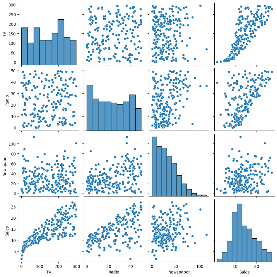 Le pairplot nous montre que : - Il semble y avoir une forte relation linéaire positive entre les dépenses TV et les ventes. - La relation entre la radio et les ventes semble également positive, mais plus dispersée. - La relation entre la presse (newspaper) et les ventes est beaucoup moins claire.
