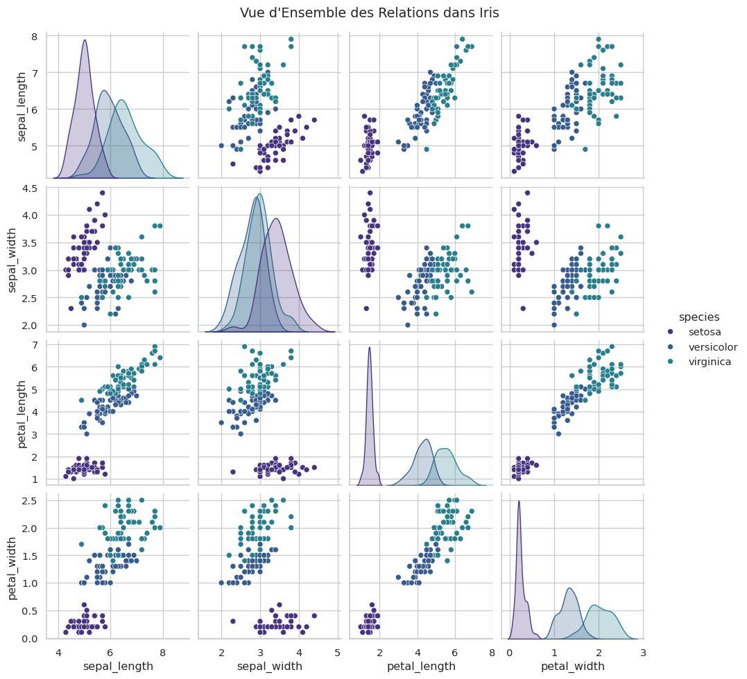 plt.suptitle("Vue d'Ensemble des Relations dans Iris", y=1.02)