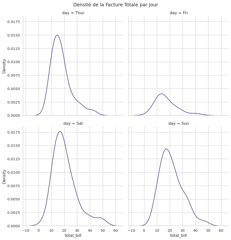 plt.suptitle("Densité de la Facture Totale par Jour", y=1.02)