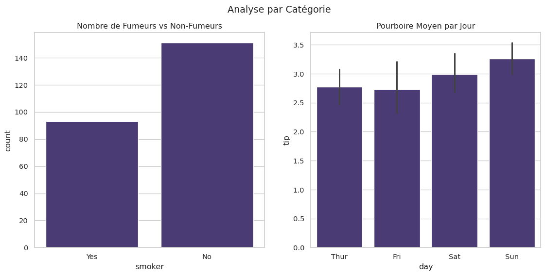 countplot: Compte les occurrences dans chaque catégorie.barplot: Affiche une estimation d’une tendance centrale (par défaut, la moyenne) pour une variable numérique par catégorie.
