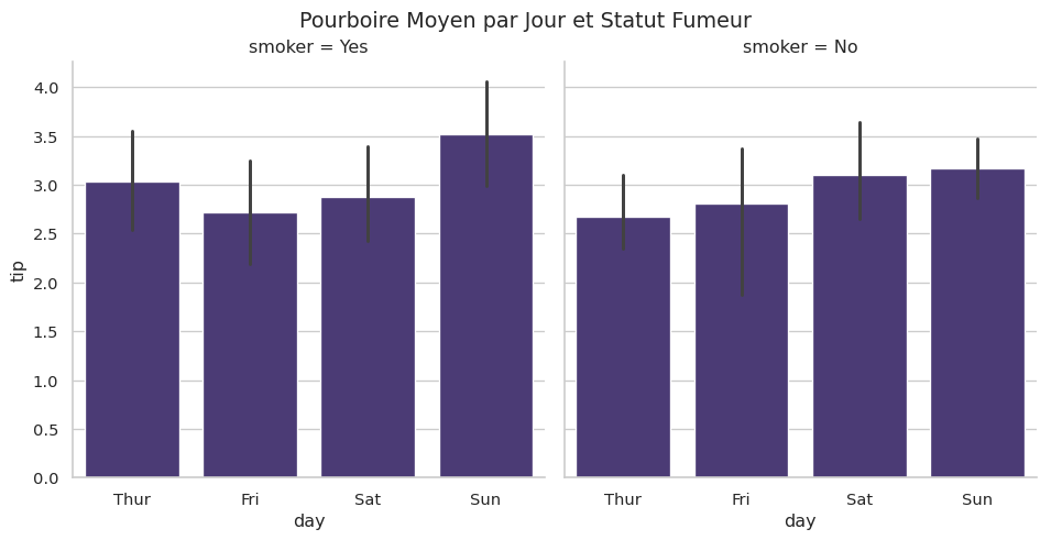 plt.suptitle("Pourboire Moyen par Jour et Statut Fumeur", y=1.02)
