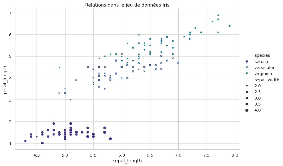 Le nuage de points est la base. scatterplot permet d’ajouter des dimensions via les paramètres hue, size, et style. relplot (relational plot) est son équivalent “figure-level”.