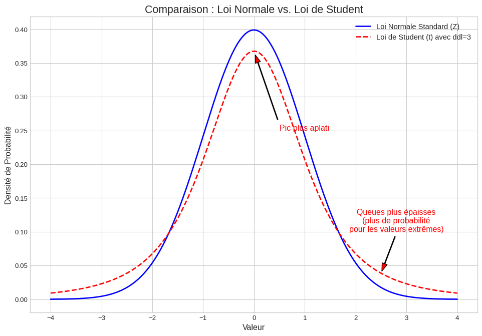 import numpy as npimport matplotlib.pyplot as pltfrom scipy.stats import norm, t# --- Paramètres ---# Degrés de liberté pour la loi de Student.# Une petite valeur (comme 3) montre bien la différence.df =3# Création d'une plage de valeurs pour l'axe des xx = np.linspace(-4, 4, 500)# Calcul des densités de probabilité (PDF)pdf_normal = norm.pdf(x, loc=0, scale=1)pdf_student = t.pdf(x, df=df)# --- Création du graphique ---plt.style.use('seaborn-v0_8-whitegrid')fig, ax = plt.subplots(figsize=(12, 8))# Tracer les deux distributionsax.plot(x, pdf_normal, 'b-', linewidth=2, label='Loi Normale Standard (Z)')ax.plot(x, pdf_student, 'r--', linewidth=2, label=f'Loi de Student (t) avec ddl={df}')# --- Ajout des annotations pour clarifier les différences ---# Annotation pour le pic plus aplatiax.annotate('Pic plus aplati', xy=(0, t.pdf(0, df)), xytext=(0.5, 0.25), arrowprops=dict(facecolor='red', shrink=0.05, width=1, headwidth=8), fontsize=12, color='red')# Annotation pour les queues plus épaissesax.annotate('Queues plus épaisses\n(plus de probabilité\npour les valeurs extrêmes)', xy=(2.5, t.pdf(2.5, df)), xytext=(2.8, 0.1), ha='center', arrowprops=dict(facecolor='red', shrink=0.05, width=1, headwidth=8), fontsize=12, color='red')# --- Finalisation du graphique ---ax.set_title("Comparaison : Loi Normale vs. Loi de Student", fontsize=16)ax.set_xlabel("Valeur", fontsize=12)ax.set_ylabel("Densité de Probabilité", fontsize=12)ax.legend(loc='upper right', fontsize=11)ax.grid(True)plt.show()