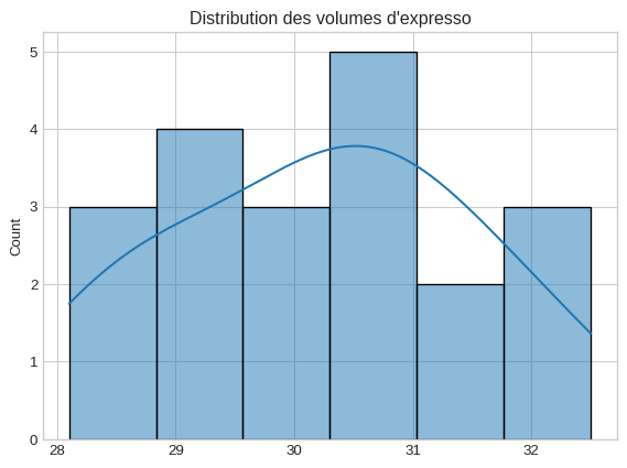 import numpy as npfrom scipy import statsimport matplotlib.pyplot as pltimport seaborn as sns# --- Les données ---data = np.array([31.5, 28.9, 30.5, 32.1, 29.5, 30.1, 31.0, 28.5, 29.9, 30.8, 32.5, 28.1, 30.2, 31.2, 29.4, 30.9, 31.8, 29.0, 30.4, 28.2])# Valeur de référence à testermu_0 =30.0# --- Étape 1 : Poser les hypothèses ---# H0: La moyenne réelle est de 30 ml. (μ = 30)# H1: La moyenne réelle est différente de 30 ml. (μ ≠ 30)# C'est un test bilatéral car on cherche une différence dans n'importe quelle direction.print("--- Étape 1: Hypothèses ---")print(f"H0: μ = {mu_0}")print(f"H1: μ ≠ {mu_0}\n")# --- Étape 2 : Exploration et Vérification des hypothèses ---# Le t-test suppose que les données sont approximativement normales.# Une visualisation rapide est souvent suffisante pour un petit échantillon.sample_mean = np.mean(data)sample_std = np.std(data, ddof=1) # ddof=1 pour l'écart-type d'échantillonprint("--- Étape 2: Statistiques de l'échantillon ---")print(f"Taille de l'échantillon (n): {len(data)}")print(f"Moyenne de l'échantillon (x̄): {sample_mean:.2f} ml")print(f"Écart-type de l'échantillon (s): {sample_std:.2f} ml\n")# Visualisationsns.histplot(data, kde=True)plt.title("Distribution des volumes d'expresso")plt.show()print("La distribution semble raisonnablement symétrique, sans valeurs aberrantes extrêmes.\n")# --- Étape 3 & 4 : Calcul de la statistique t et de la p-value ---# Formule: t = (x̄ - μ₀) / (s / sqrt(n))# En pratique, on utilise directement une fonction pour éviter les erreurs.print("--- Étape 3 & 4: Réalisation du test ---")# Utilisation de la fonction ttest_1samp de la bibliothèque scipy.statst_statistic, p_value = stats.ttest_1samp(a=data, popmean=mu_0)print(f"Statistique t calculée: {t_statistic:.3f}")print(f"P-value (bilatérale): {p_value:.4f}\n")# --- Étape 5 : Interprétation et Conclusion ---alpha =0.05# Seuil de significativitéprint("--- Étape 5: Conclusion ---")print(f"Seuil de significativité (alpha): {alpha}")if p_value < alpha:print(f"Décision: Rejeter H0 (car {p_value:.4f} < {alpha}).")print("Conclusion: Il y a une différence statistiquement significative entre le volume moyen de notre échantillon et l'objectif de 30 ml.")else:print(f"Décision: Ne pas rejeter H0 (car {p_value:.4f} >= {alpha}).")print("Conclusion: Nous n'avons pas suffisamment de preuves pour affirmer que le volume moyen dispensé par la machine est différent de 30 ml.")