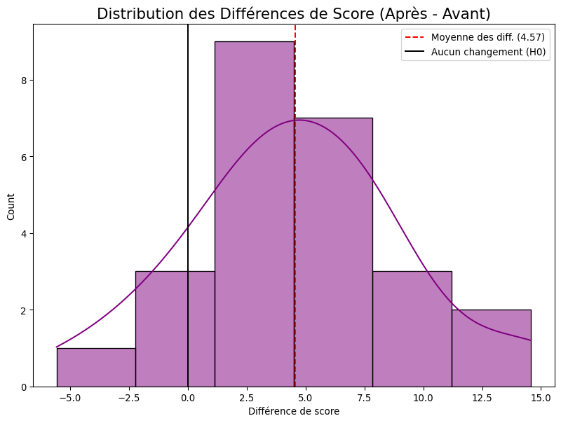 - Tester la Moyenne des Différences : On réalise un t-test à un échantillon sur cette nouvelle colonne de différences.