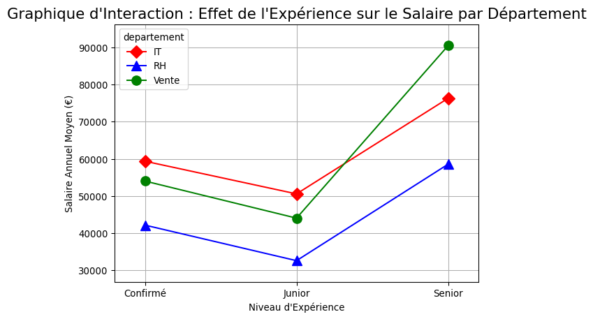L’entreprise Innovatech veut comprendre comment le département et le niveau_experience (‘Junior’, ‘Confirmé’, ‘Senior’) influencent le salaire_annuel.