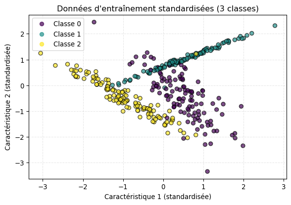 plt.title('Données d\'entraînement standardisées (3 classes)')