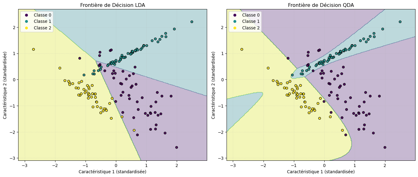Plus de flexibilité, mais un coût : QDA a plus de paramètres à estimer que LDA (une matrice de covariance complète pour chaque classe au lieu d’une seule partagée). Elle est donc plus sujette au sur-apprentissage si le nombre d’échantillons par classe n’est pas suffisamment grand par rapport au nombre de caractéristiques.